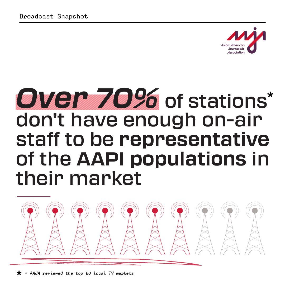 - There are not enough Asian American Pacific Islander (AAPI) journalists on television. AAJA took a snapshot of AAPI on-air talent in the top 20 local TV markets and found that nearly 25 percent of stations had no AAPIs on air and more than 70 percent of the stations didn’t have enough on-air staff representative of their AAPI populations in their markets.